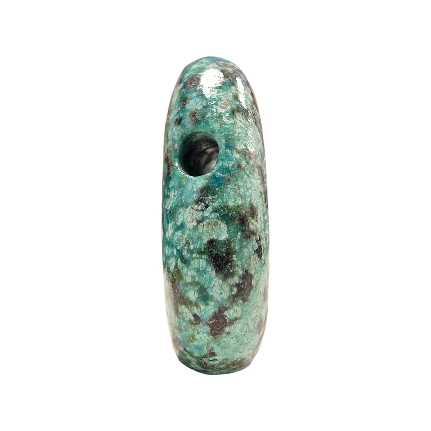 Side profile view of a drilled African Turquoise stone, highlighting the precision of the drill hole and the variegated green and black matrix.