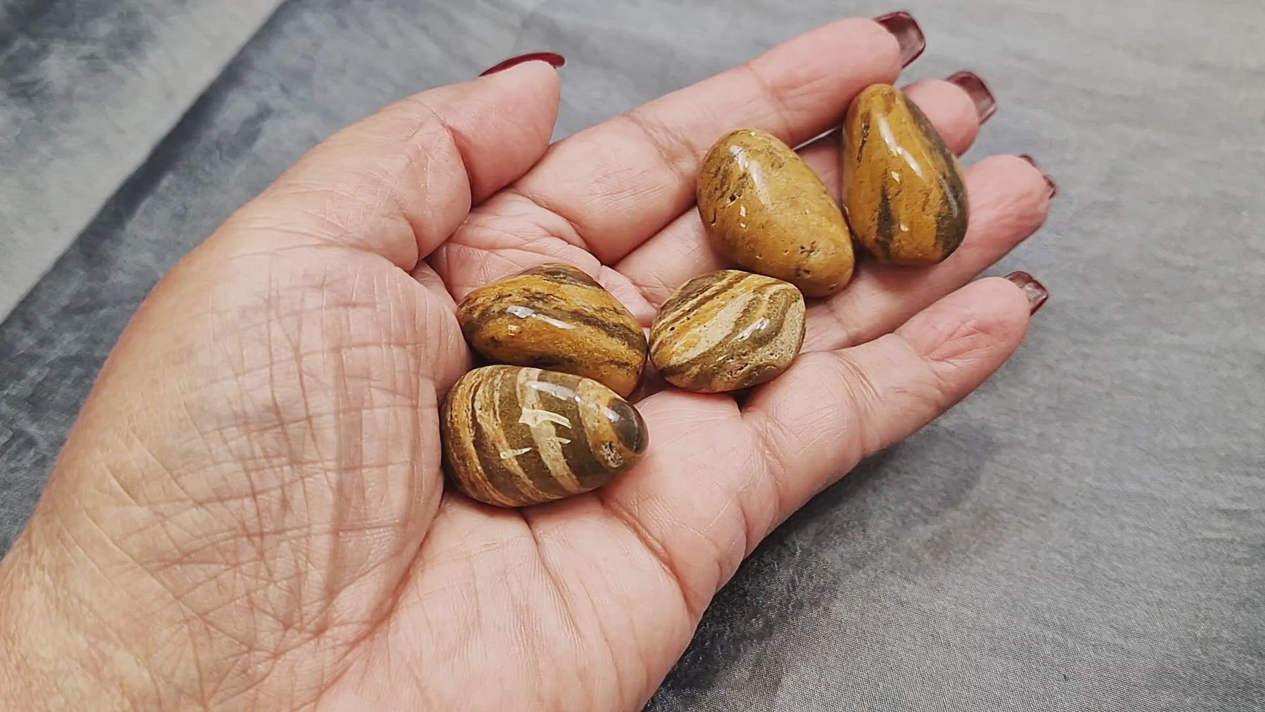 We will intuitively choose a Cappuccino Jasper Tumble Stone from our collection for you. Each stone has unique patterning of cream, caramel and brown hues — no two are identical.