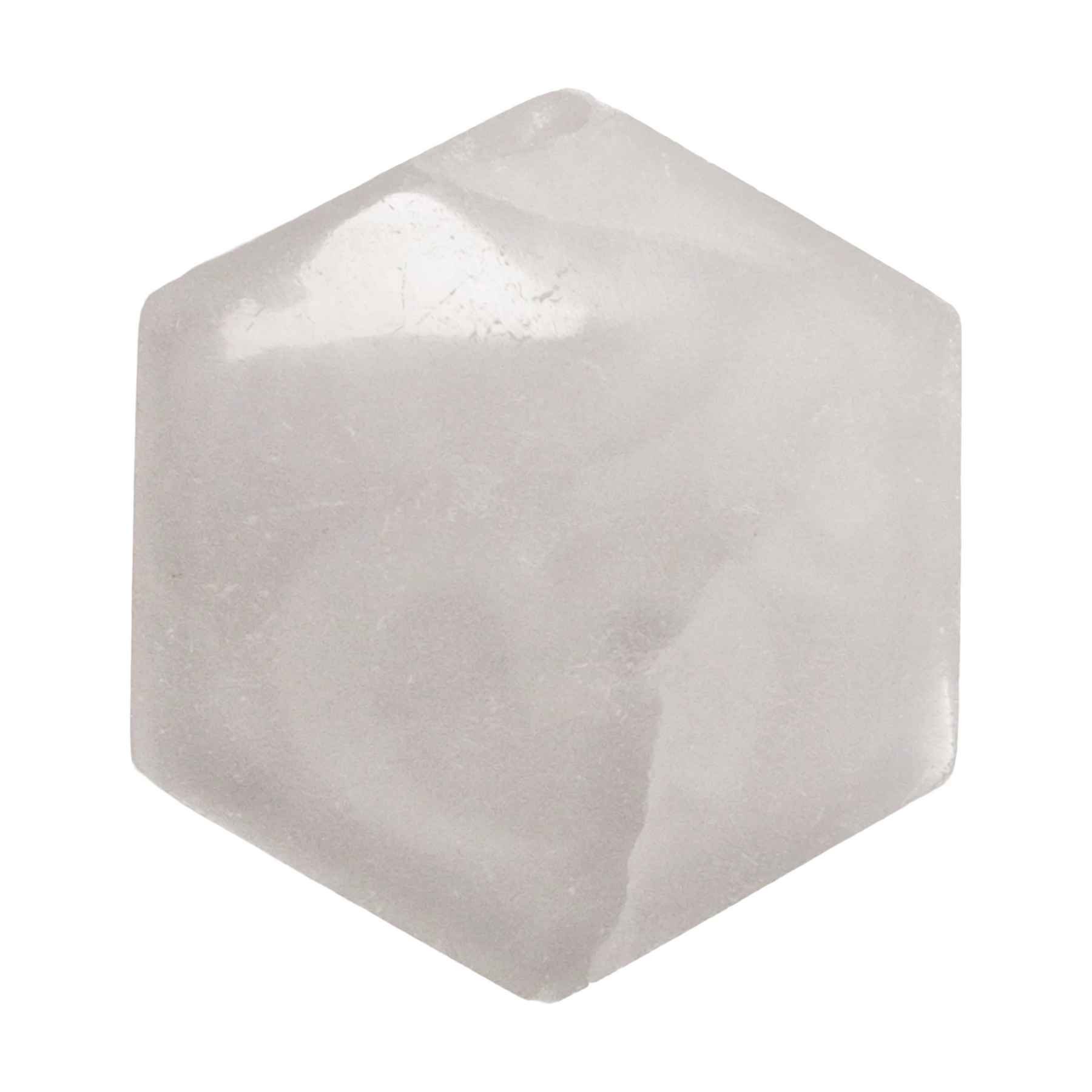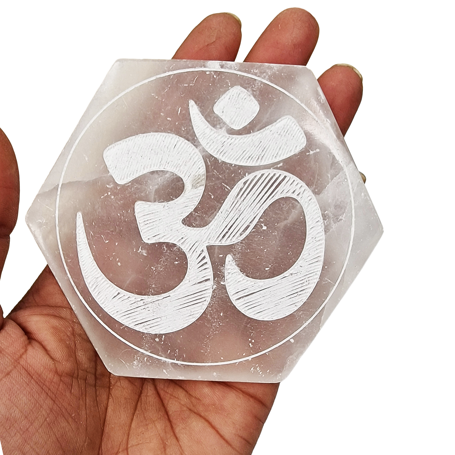 Selenite, a crystalline variety of gypsum (CaSO₄·2H₂O), is renowned for its luminous glow and natural striations that reflect light. With a Mohs hardness of 2, it is soft enough to carve into sacred shapes, enhancing both its beauty and energy. This hexagonal charging disc is engraved with the Ohm symbol, representing universal vibration, balance, and spiritual harmony. Its 10 cm size makes it an ideal surface for cleansing and recharging crystals, jewellery, or small tools.